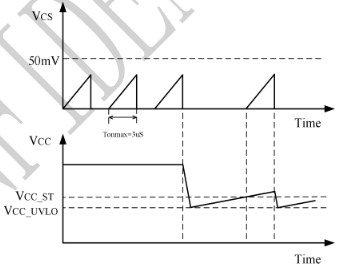 當VCC電壓超過設定的過壓閾值(通常為55V至59.5V)時,LP8776AH會觸發過壓保護機制。此時,芯片將停止輸出PWM信號,防止因過高的電壓對芯片內部電路和外部設備造成損害。過壓保護功能為芯片提供了一個安全的工作電壓范圍,確保其在電源電壓異常升高時能夠及時采取保護措施。