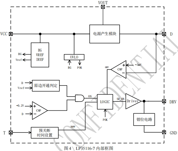 該芯片采用了多項專利技術,包括整流管開通技術、周期追蹤技術和死區時間外置可編程技術。通過這些技術,LP35116-7 能夠有效避免因激磁振蕩引起的誤動作,減少關斷延遲,從而顯著提高電源轉換效率。此外,其多樣化的 VCC 供電技術確保了在多種輸出電壓條件下,芯片的穩定供電,進一步提升了系統的可靠性和適應性。