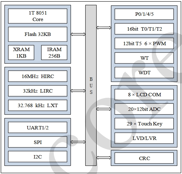 時(shí)鐘系統(tǒng):芯片內(nèi)置 16MHz 的高速振蕩器(HIRC)和 32kHz 的低速振蕩器(LIRC),同時(shí)支持外部低速晶振(LXT)輸入,最高可達(dá) 32.768kHz。這些時(shí)鐘源為系統(tǒng)提供了靈活的時(shí)鐘選擇,以適應(yīng)不同的工作模式和功耗要求。