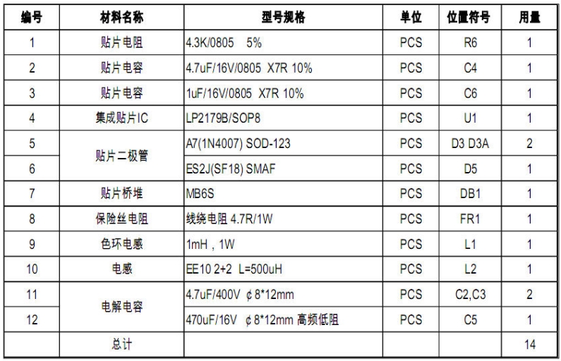 該電源方案的 BOM 表詳細(xì)列出了所需的各種元件及其規(guī)格和用量。其中包括貼片電阻、貼片電容、集成貼片 IC、貼片二極管、貼片橋堆、保險絲電阻、色環(huán)電感、電感、電解電容等。這些元件均為高品質(zhì)的電子元件,能夠確保電源的穩(wěn)定性和可靠性。通過合理的元件選擇和用量控制,該方案在保證性能的同時,也具有較高的性價比。