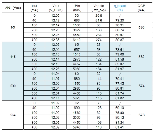 測試報告詳細(xì)記錄了該電源方案的各項(xiàng)測試數(shù)據(jù)和結(jié)果。在紋波、調(diào)節(jié)和效率測試中,其紋波電壓在不同輸入電壓和負(fù)載條件下均能夠保持在較低水平,表現(xiàn)出良好的輸出穩(wěn)定性。在效率方面,隨著輸入電壓的升高和負(fù)載的增加,其效率也相應(yīng)提高,最高可達(dá) 82.07%,顯示出較高的能量轉(zhuǎn)換效率。