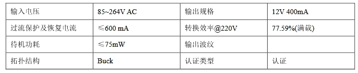 該電源方案的輸入電壓范圍為 85~264V AC,能夠適應(yīng)不同國家和地區(qū)的電網(wǎng)電壓,具有廣泛的適用性。其輸出規(guī)格為 12V 400mA,能夠?yàn)樽詣泳戆l(fā)器提供穩(wěn)定的電源。