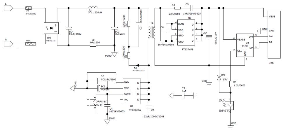 FT8493KA快充20W充電器電源參考設計專為滿足現代電子設備對快速充電的需求而設計。它支持全電壓輸入(90-264Vac),能夠適應不同國家和地區的電網標準,輸出功率為20W,支持多種輸出電壓和電流組合,如12V1.67A、9V2.22A和5V3A,可廣泛應用于智能手機、平板電腦等多種設備的充電需求。