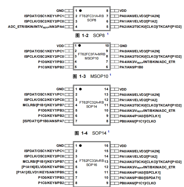 FT62FC6X系列微控制器根據(jù)不同的封裝類型和功能需求,提供了多種引腳配置。以下是結(jié)構(gòu)框圖及一些常見(jiàn)的引腳及其功能介紹: