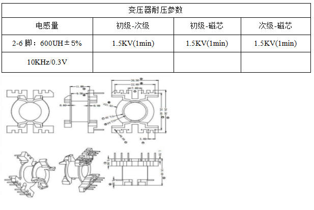 成品測試:1 kHz/0.3 V下LP 600 μH ±5 %,漏感<30 μH,Q>60