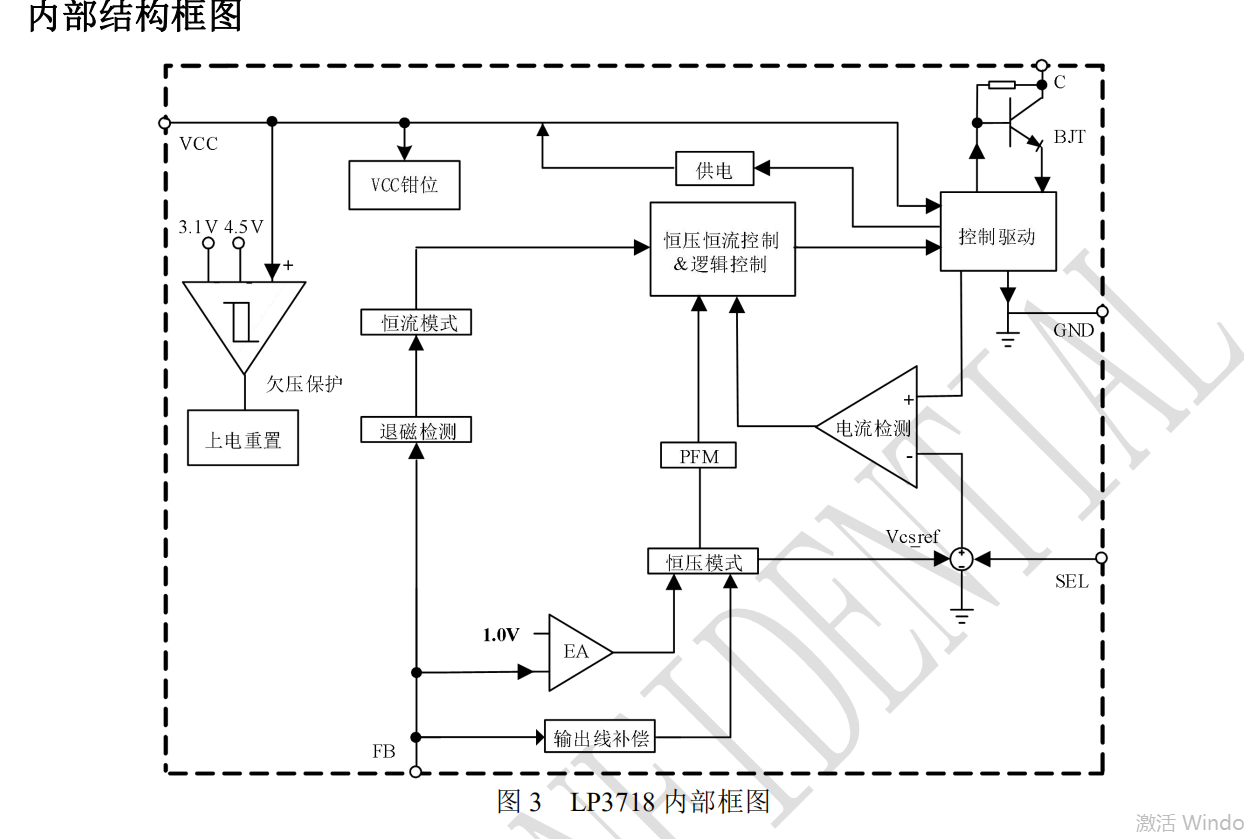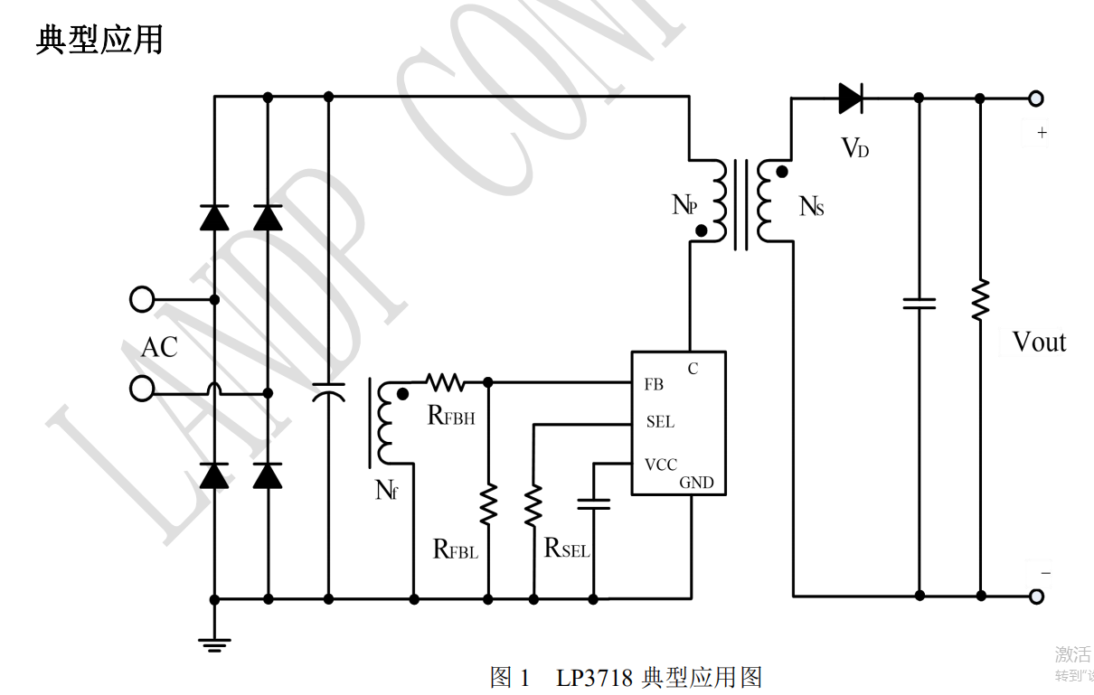 為了實現(xiàn)系統(tǒng)成本的致簡化,LP3718 內(nèi)置啟動電路,外圍不需要啟動電阻;采用自供電的方式 來取消輔助繞組 VCC 供電二極管。 為了實現(xiàn)更好的輸出電壓調(diào)整率,LP3718 內(nèi)置 輸出線纜補償功能,可以通過設(shè)定 FB 外置上偏電 阻的值來調(diào)節(jié)輸出線纜補償值。