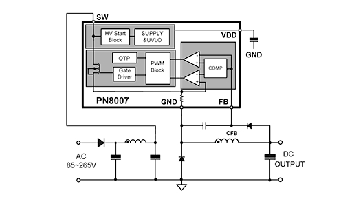 PN8007集成PFM控制器及650V高可靠性MOSFET,用于外部元器件極精簡的小功率非隔離開關電源。 PN8007內置650V高壓啟動,實現系統快速啟動、超低待機功能。該芯片提供了完整的智能化保護功能,包括過載保護,欠壓保護,過溫保護。另外PN8007具有優異的EMI特性。