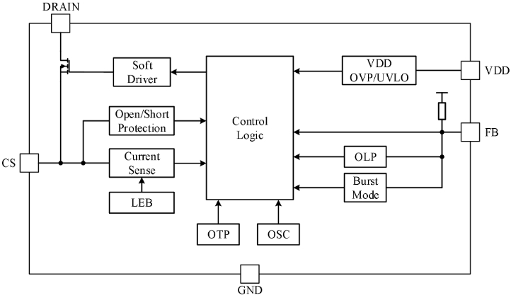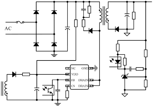 芯片通過(guò)對(duì)輸出采樣并反饋到光耦獲得高精度的恒壓輸出。內(nèi)置的斜率補(bǔ)償電路確保了峰值電流模控制的穩(wěn)定性。內(nèi)部集成的頻率抖動(dòng)功能可以改善EMC,降低EMI濾波成本。