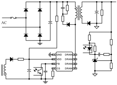 芯片通過對輸出采樣并反饋到光耦獲得高精度的恒壓輸出。內(nèi)置的斜率補償電路確保了峰值電流??刂频姆€(wěn)定性。內(nèi)部集成的頻率抖動功能可以改善EMC,降低EMI濾波成本。