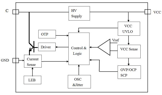 其內部集成了高壓功率開關,采用專利電壓電流控制技術,無需外部電壓反饋和電流偵測電路即可實現精確的電壓和電流調節,極大的方便客戶使用。