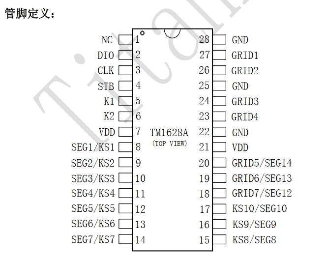 CMOS工藝:TM1628A采用CMOS工藝制造,確保了產品的可靠性和穩定性。