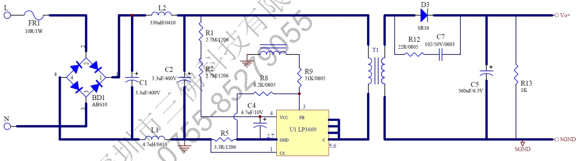 電路設(shè)計:LP3669A適用于雙繞組原邊反饋控制,系統(tǒng)工作于斷續(xù)模式,適用于充電器和適配器以及其他輔助類電源。LP3669A采用特有的輸出線損補(bǔ)償技術(shù),可以有效的補(bǔ)償輸出電流在輸出線上的損耗壓降;恒壓時,采用谷底導(dǎo)通技術(shù),提升恒壓效率。
