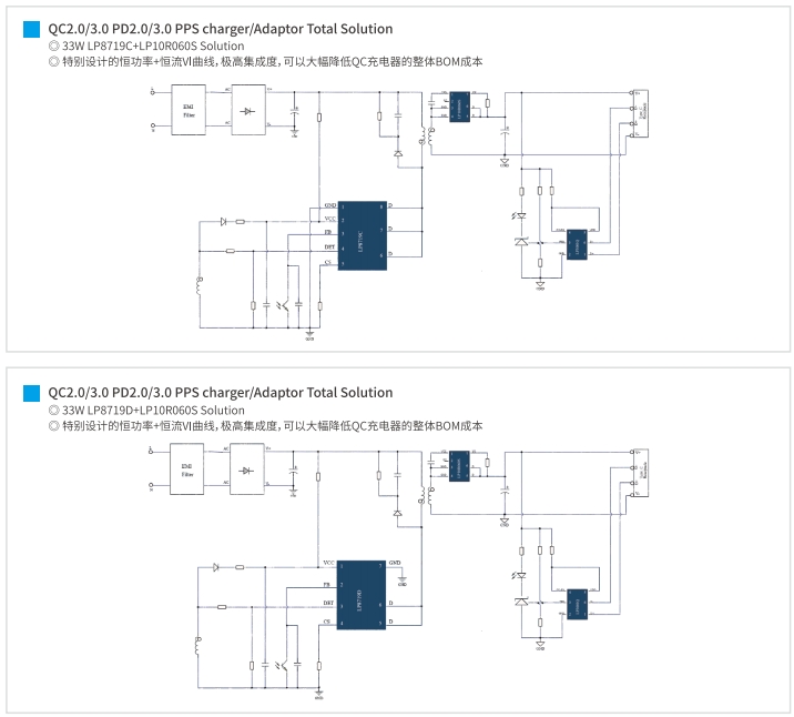 LP8719C/D是一款高效的PWM控制器,它支持33W的輸出功率,并能夠根據設備的充電需求動態調整輸出電流和電壓。這款控制器的恒功率+恒流VI曲線設計,確保了充電過程中的穩定性和效率。