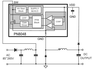PN8048是一款專為移動(dòng)設(shè)備設(shè)計(jì)的電源管理IC,它采用了先進(jìn)的電源轉(zhuǎn)換技術(shù),以實(shí)現(xiàn)高效率和低功耗。PN8048通常用于需要快速充電和高效率電源轉(zhuǎn)換的場(chǎng)合,如智能手機(jī)、平板電腦等。PN8048典型應(yīng)用圖如下所示:
