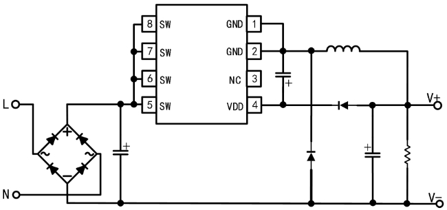 芯片內(nèi)部集成了高壓?jiǎn)?dòng)電路、電流采樣電路和電壓反饋回路,無需外部啟動(dòng)電阻、電流采樣電阻和電壓采樣電阻,進(jìn)一步降低了系統(tǒng)成本和體積。